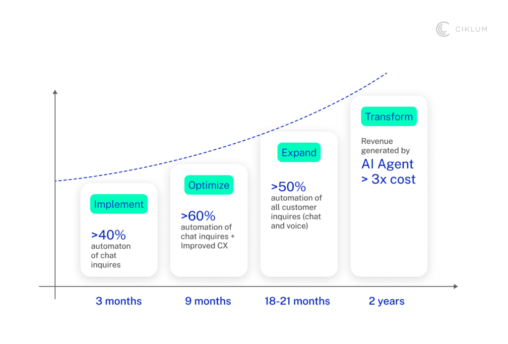 - 18–21 months: More than 50% of all inquiries, including chat and voice, are handled by AI. This is the point where scaling accelerates and momentum becomes self-sustaining.
